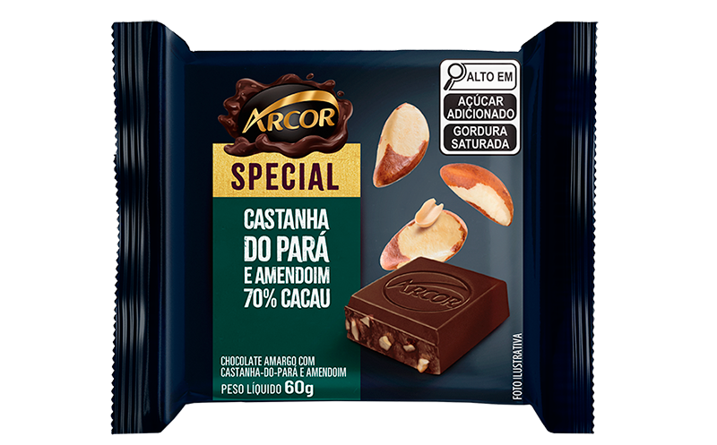 CHOCOLATE AMARGO COM CASTANHA-DO-PARÁ E AMENDOIM – INGREDIENTES: MASSA DE CACAU, AÇÚCAR, CACAU EM PÓ, CASTANHA-DO-PARÁ, MANTEIGA DE CACAU, AMENDOIM, GORDURA VEGETAL, EMULSIFICANTE LECITINA DE SOJA E AROMATIZANTE.